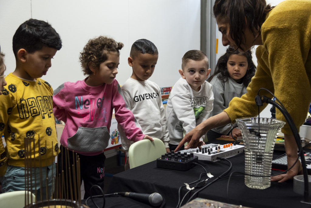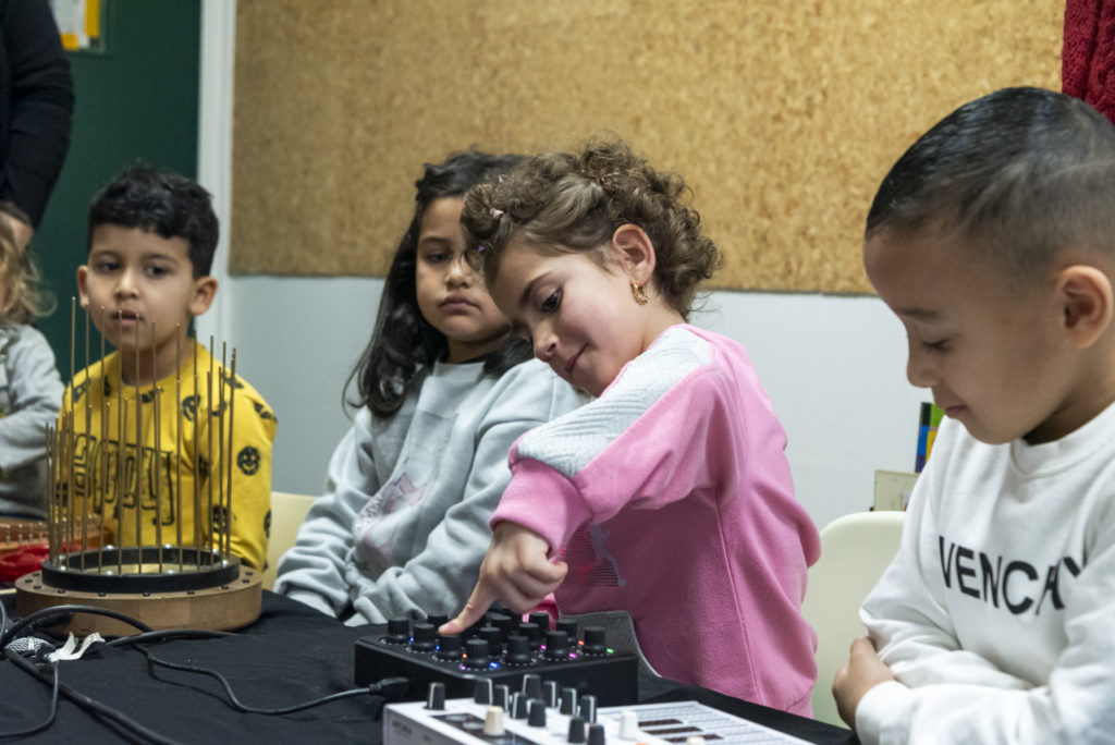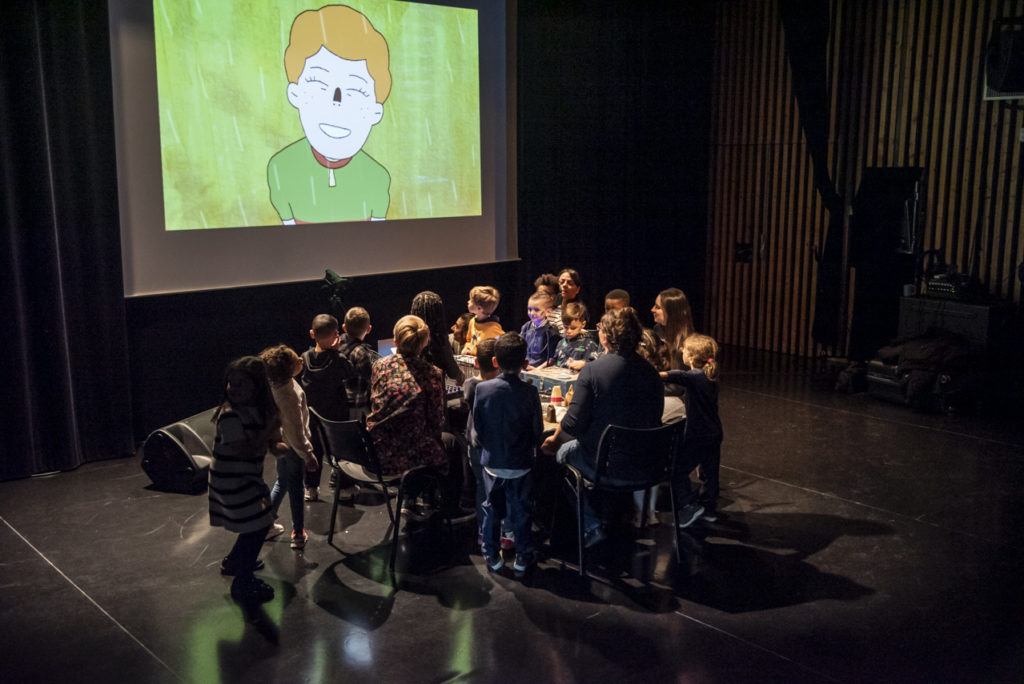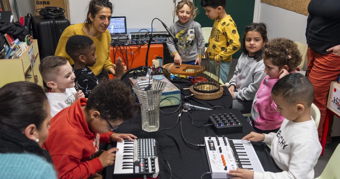 Durant une semaine, la classe de moyens-grands d’Aurore Vidal, à l’école Anatole France, a accueilli l’artiste Flaca Boonse et son instrumentarium loufoque. L’artiste grenobloise, qui jouait la semaine suivante à La Source son ciné-concert Jardins Enchantés, a ainsi créé avec cette classe un ciné-concert. Les élèves ont d’abord découvert les instruments atypiques de l’artiste, et ont pu les tester. Des plus classiques, comme les claviers, micros et boîte à sons, aux plus étonnants, comme l’hydrophone, un micro qui diffuse le bruit de l’eau, ou des cloches de vache qui tintent et des flûtes a coulisses, les instruments ont été essayé par des élèves curieux et enjoués. Ils ont ensuite visionné collectivement le court-métrage sélectionné par Flaca Boonse, puis ont réfléchi à la bande sonore qu’ils souhaitaient créer avec les instruments dont ils disposaient. Réussir à jouer chacun son tour pour illustrer le film s’est révélé être un exercice difficile d’écoute et de coordination ! Mais