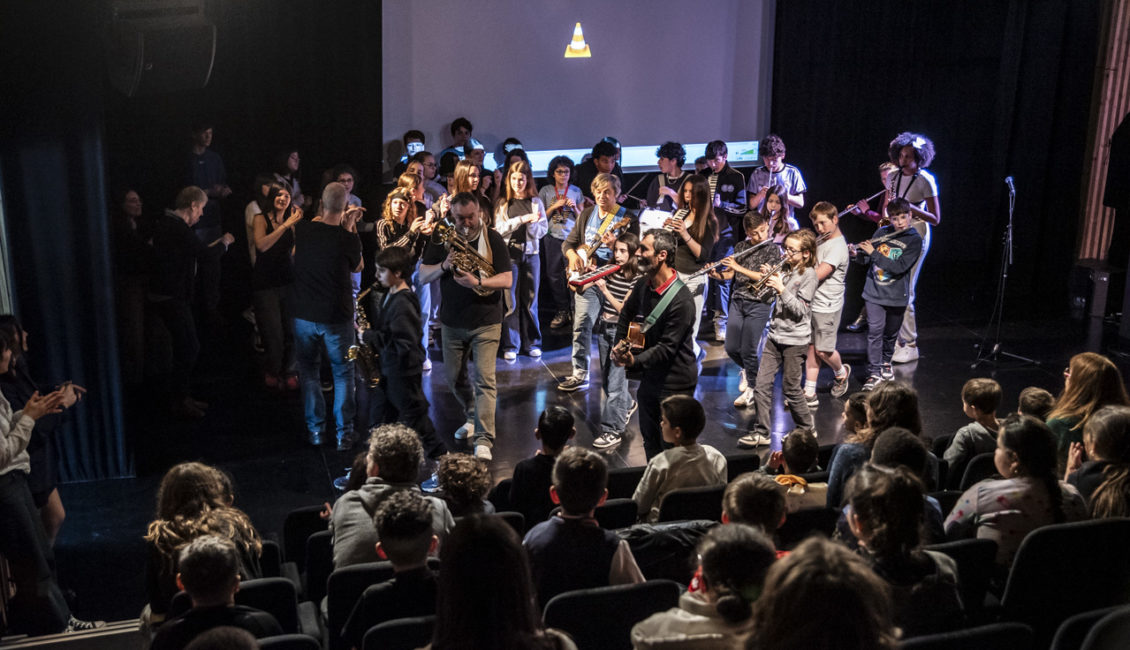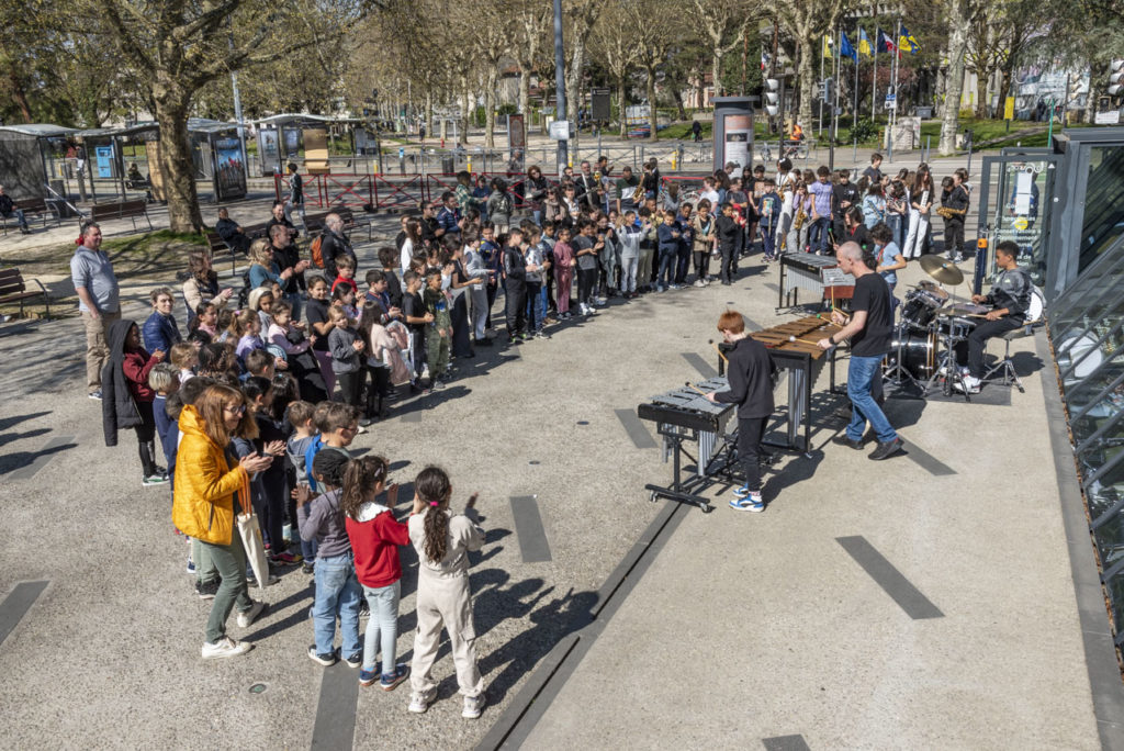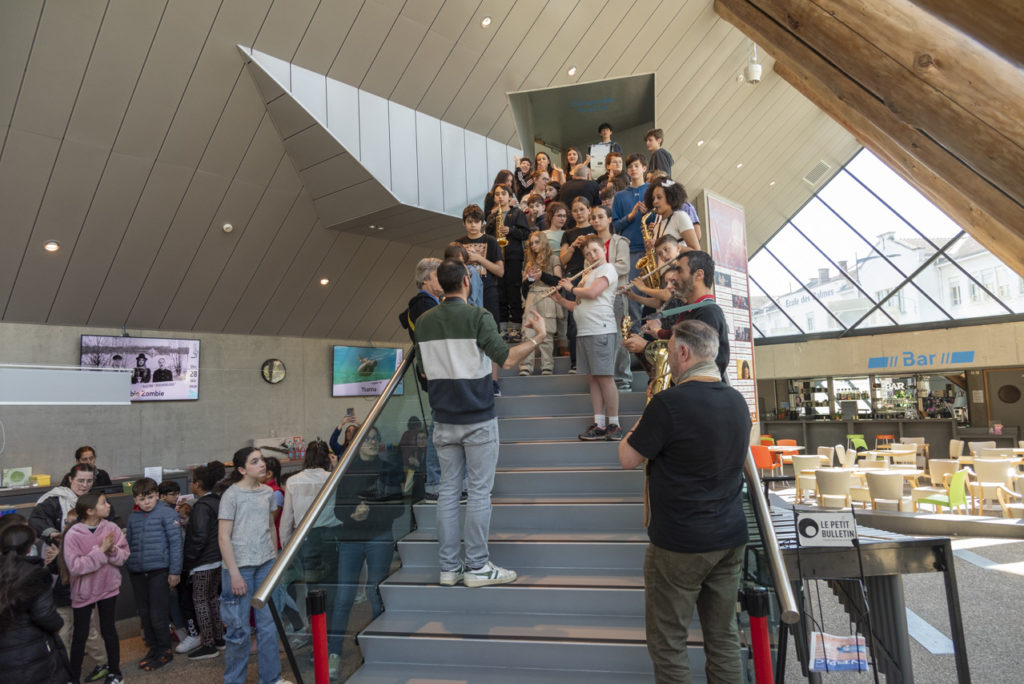 Le temps de restitution était initialement imaginé comme un temps d’écoutes immersive des cinq épisodes à la Source, en auditorium. Les CHAM étant impliqué dans le projet, l’équipe enseignante du conservatoire a participé à l’élaboration de la restitution, qui s’est transformé en un événement à part entière. L’équipe pédagogique du conservatoire a imaginé une déambulation musicale, menée par les 80 élèves de CHAM au sein de la Source, pour que les élèves d’élémentaire venus découvrir le feuilleton radio participent à une réelle expérience immersive. Autour du temps d’écoute du feuilleton, les élèves ont ainsi pu découvrir les différents cours de pratique collective à travers des étapes au sein de la Source : une démonstration des classes de percussions sur le parvis, une initiation aux percussions corporelles au rythme de l’ensemble à vent en ampli, un morceau de l’orchestre CHAM dans le hall. Ils étaient guidés au sein de la Source par une fanfare éphémère d’élèves, qui les emmenaient d’un étape à l’autre. Une après-midi de fête au conservatoire, où élèves et enseignants ont joué ensemble devant les 170 élèves de l’école des Balmes, qui étaient ravis.