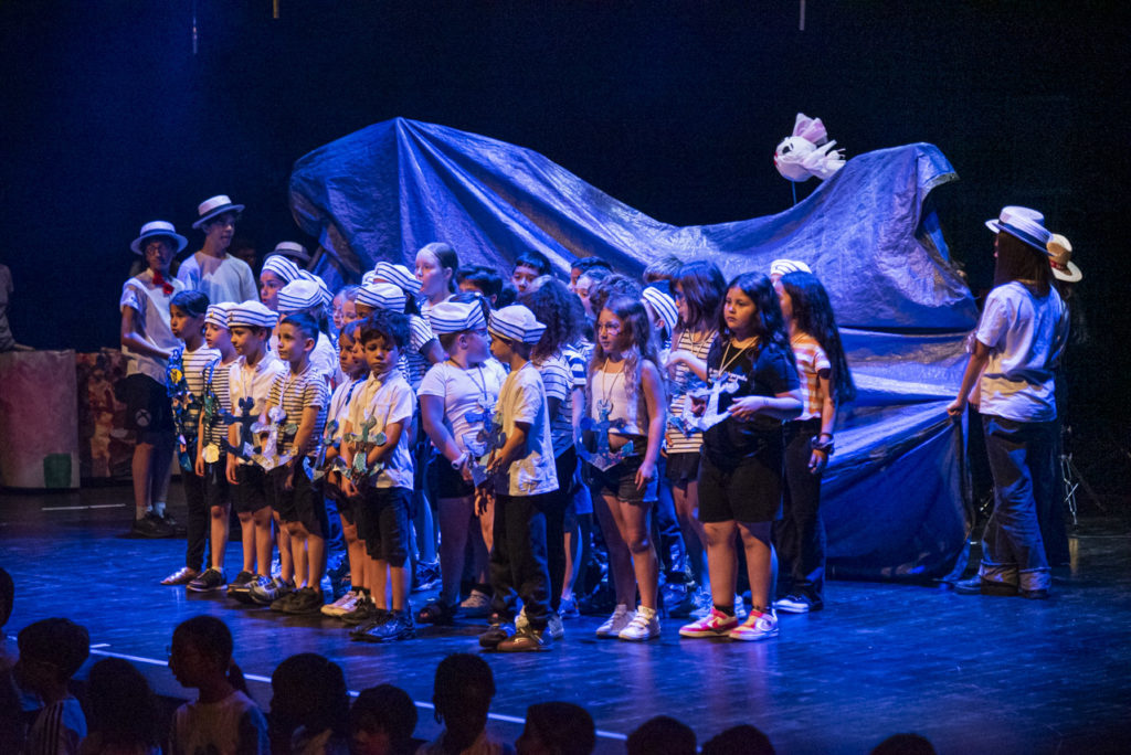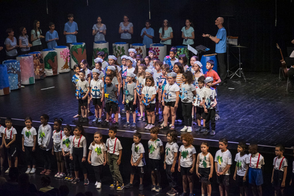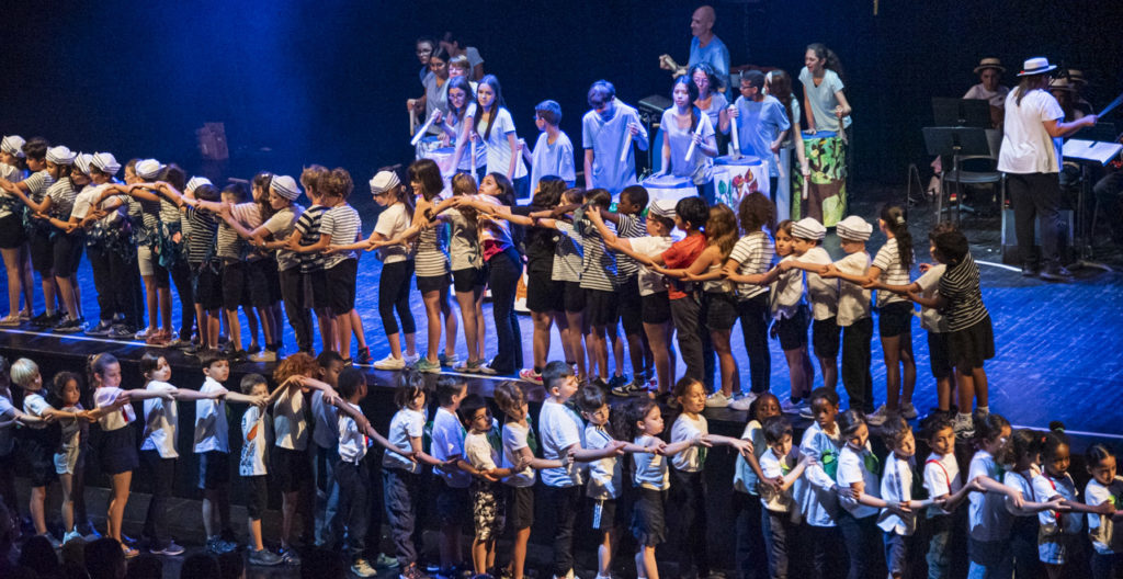 Début juin, les 108 élèves mobilisés sur le projet se sont retrouvés à la Source pour la dernière ligne droite de la création de ce spectacle hors-norme. Ils ont répété pendant trois jours sur la grande scène, prenant petit à petit leurs marques dans cette salle pouvant accueillir 434 spectateurs. Ils ont peaufiné leurs déplacements, affiné le tuilage entre parties musicales, théâtrales et chantées. Ces jours de travail étaient exigeants en terme de concentration. Un programme d’ateliers poncuait les journées pour permettre aux enfants de décompresser, et de passer du temps ensemble. Ils ont ainsi pu visiter la Source, rencontrer les trois musiciens professionnels du spectacle, participé à un temps de démonstration des lumières de la salle, fait un éveil corporel, joué, chanté, fait des origamis en forme de bateaux pour décorer le hall… autant d’ateliers qui ont nourri cette expérience.