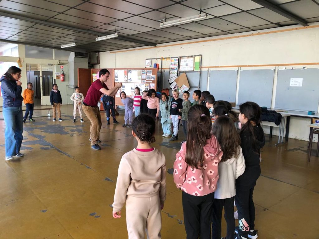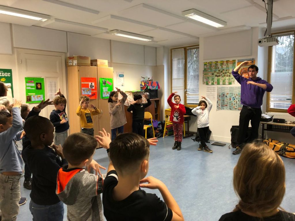 L’ensemble des élèves a également suivi des ateliers de théâtre avec l’intervenant Antoine Berezai de la Cie des Gentils, afin de mettre en mouvement le conte et le transformer en véritable spectacle incarné par les enfants. Il a oeuvré comme chef d’orchestre en faisant le lien entre les parties travaillées par les différents groupes. Il est intervenu à partir de janvier dans les classes, faisant travailler les élèves autour des questions de placement dans l’espace, d’attention au groupe, de gestes parasites, d’aisance et de posture. Ses ateliers, par leur forme ludique et inventive, ont conquis les élèves comme les enseignants. L’une des difficultés était de réussir à faire prendre conscience aux participants que d’autres classes répétaient également le même spectacle : Antoine faisait le lien entre eux grâce à des vidéos et des exercices en commun. Au final, les élèves d’élémentaire ont bénéficié de 14 heures d’intervention théâtrale entre janvier et mai. Les Musiciens Intervenants en Milieu Scolaire étaient présents sur ces interventions et ont ainsi pu découvrir de nouveaux outils pour leurs cours.